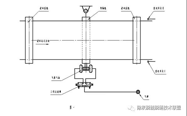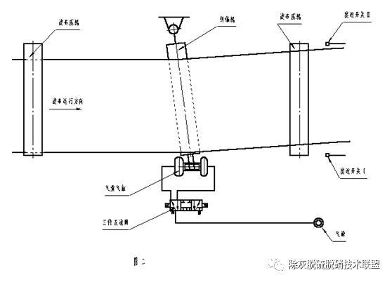 它由糾偏輥、糾偏氣囊、二位五通電控滑閥和感應(yīng)開(kāi)關(guān)等組成。它的作用就是糾正濾布跑偏,其原理是通過(guò)改變糾偏輥的角度來(lái)達(dá)到糾正濾布跑偏的。